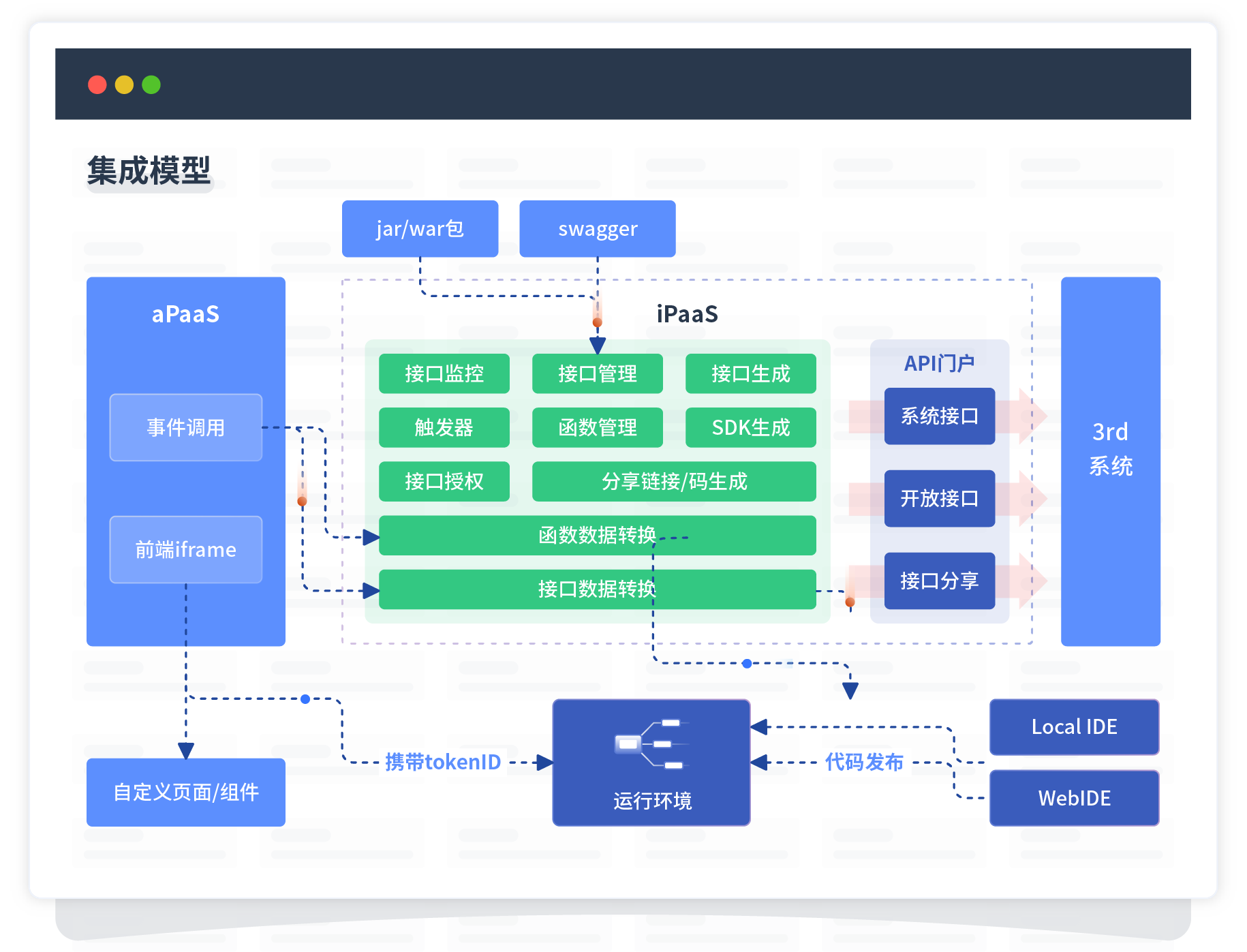 集成模型包括平台本身前、、后端能力的扩展,,,也支持通过API门户和第三方系统进行交互。。。