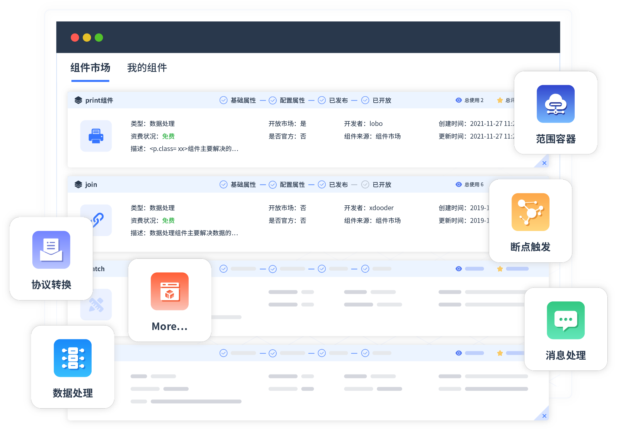 针对集成场景,,,GOPAY钱包提供组件市场,,,,例如协议转换、、、、消息处理、、、文件操作等。。除平台提供的组件外,,,客户可以自定义所需组件。。
