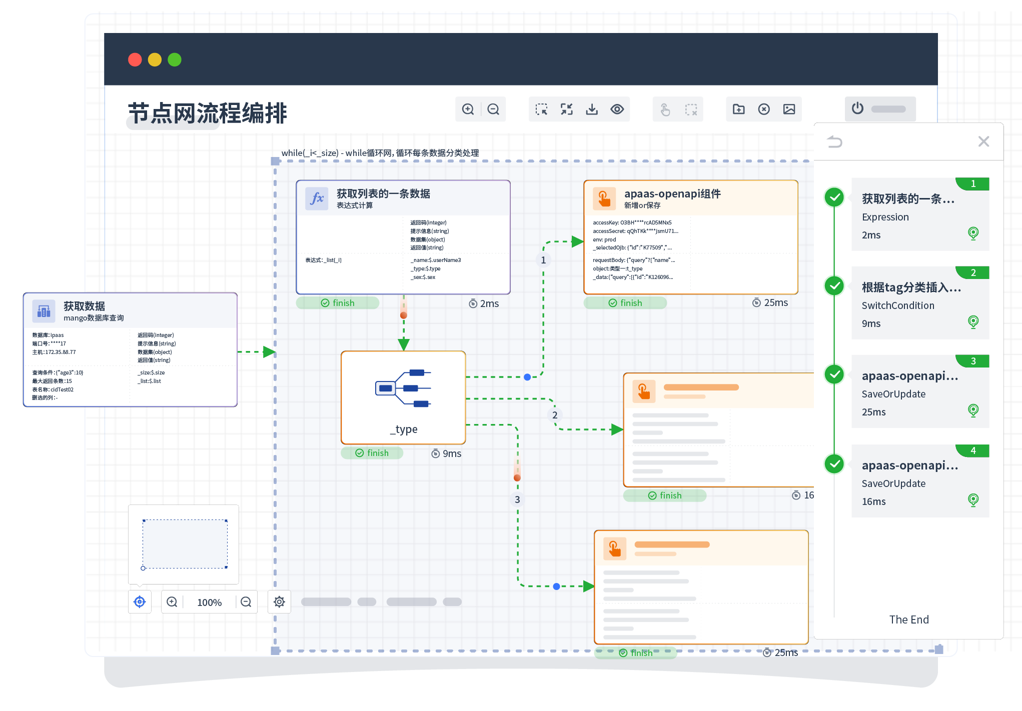 针对集成场景,,,组件定义后支持进行流程编制,,,不同于传统代码方式,,,,通过图形化展示,,,支持在线调试、、、、日志查看和运行回放。。