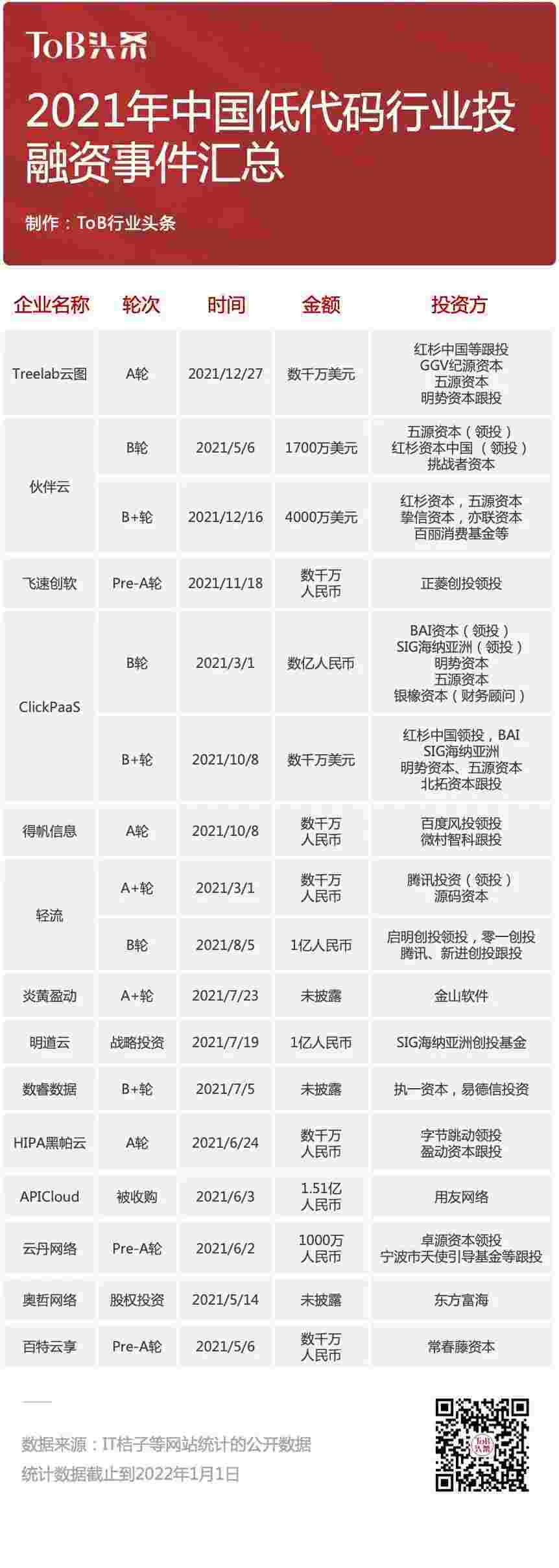 到2021年,,,无/低代码投融资规模势头更甚,,,,其中包括轻流两轮融资(A+轮数千万人民币,,B轮近亿人民币)、、、、GOPAY钱包 两轮融资(B轮数亿人民币,,,,B+轮数千万美元)、、、、百特云享数千万元Pre-A轮融资......